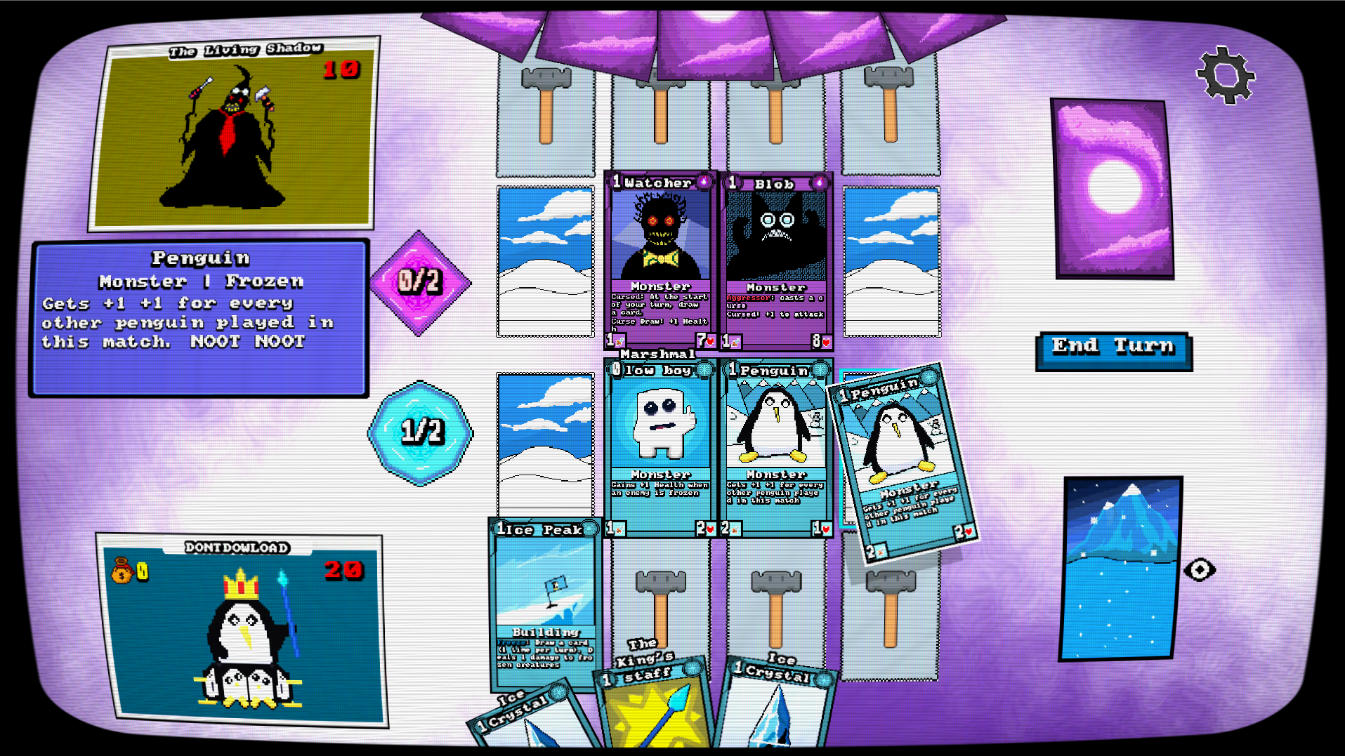 So much cool art in this game, theres like 50 unique cards with hand drawn art. The card game itself is really fun too + some replayability with the 2 different choices of decks. great work!